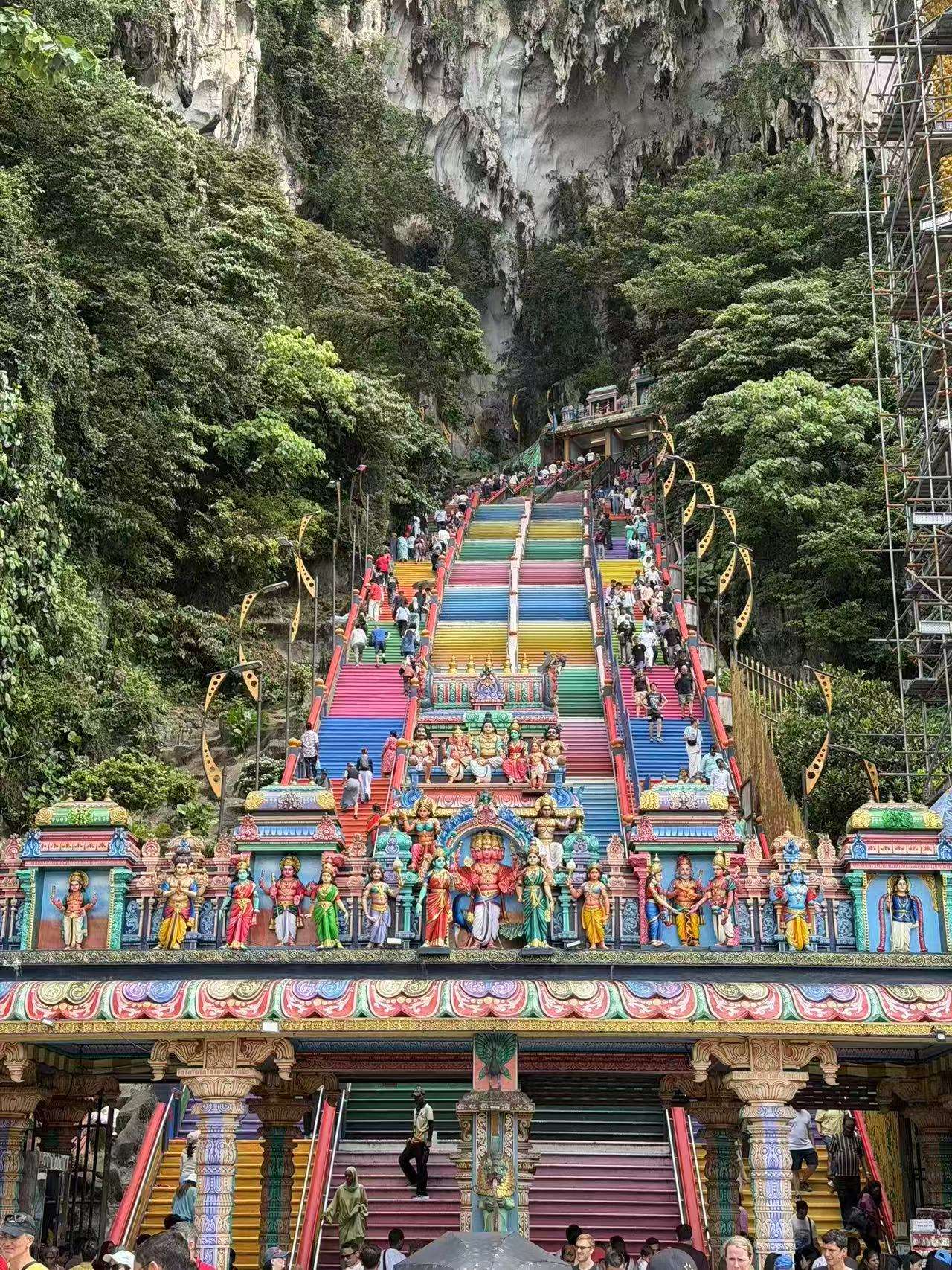 最后一天,我们去了马来西亚国家皇宫、黑风洞和乌鲁卡里山等。马来西亚国家皇宫前,我们在此外观并与门口守卫的士兵拍照留念。黑风洞的彩色阶梯前,我们互相鼓励完成攀登。我们乘缆车到达乌鲁卡里山,感受了建在云顶上的繁华的商场等景观。虽不舍,但是在归途中,我们满载而归,大家在欢声笑语中坐上了回青岛的飞机。